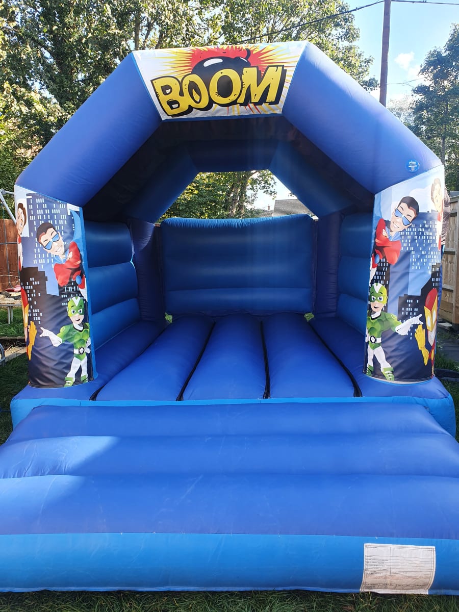 Here is our fantastic Super Hero bouncy castle In blue .. Great fun for children up to 12 years old.