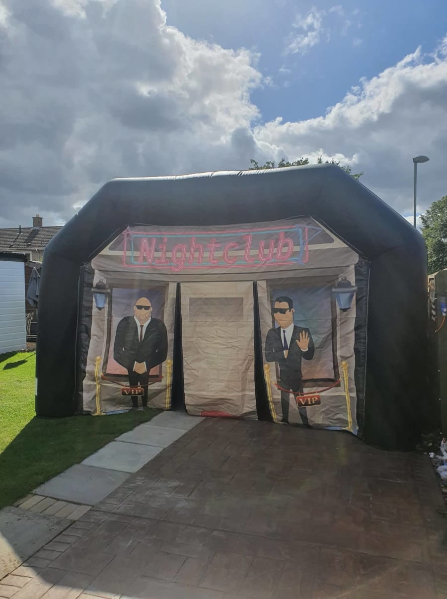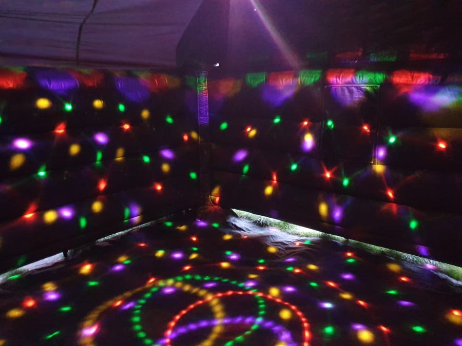 Inflatable night club 15ft x 15ft Ideal for adult and teenager party's (Please Note this is not a Bouncy Castle) if your looking for a disco bouncy castle please follow the link Disco Bouncy Castle. Our night club comes complete with built in speaker and disco light so you can dance your night away. Just connect your phone laptop pc or tablet to our blue tooth speakers. This has a 50 watt speaker installed in the back wall and bright lights in the roof giving the full night club effect. This Night club has inflatable walls and roof and a hard base still needs to be pegged to the ground so has to be installed on grass or indoor hire.